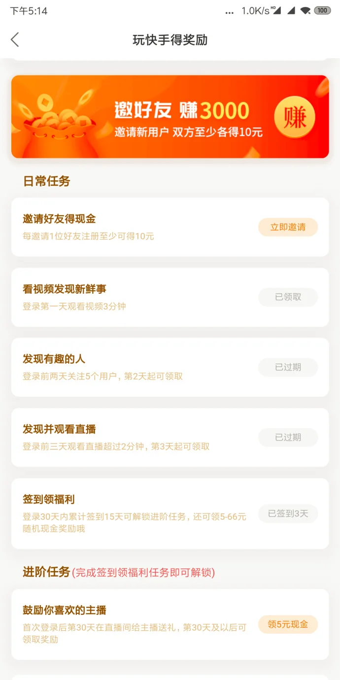 c. 新用户登录快手第3天,完成看直播任务,你可以获得3元奖励