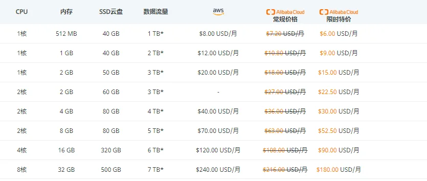 * 悉尼和孟买节点的流量包相比其他海外节点会更小。其对应的规格为1核 - 512 MB -1TB , 1核 -1GB - 1TB, 1核 - 2GB - 2TB, 2核 - 2GB - 2TB, 2核 - 4GB - 2TB, 2核 - 8GB - 3TB, 4核 - 16GB - 3TB, 8核 - 32GB - 4TB。