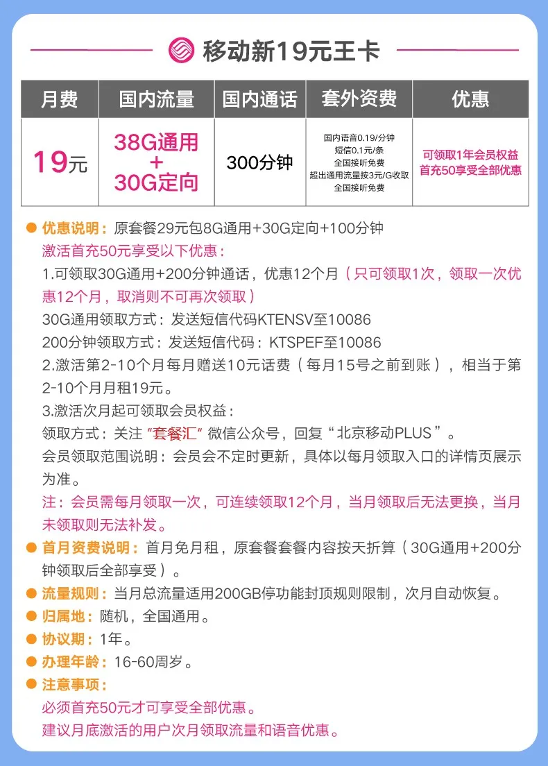 北京移动王卡,免费办理,每月38G全国流量+30G定向流量300分钟通话 + 一年视频会员,全国包邮,本卡全国包邮。