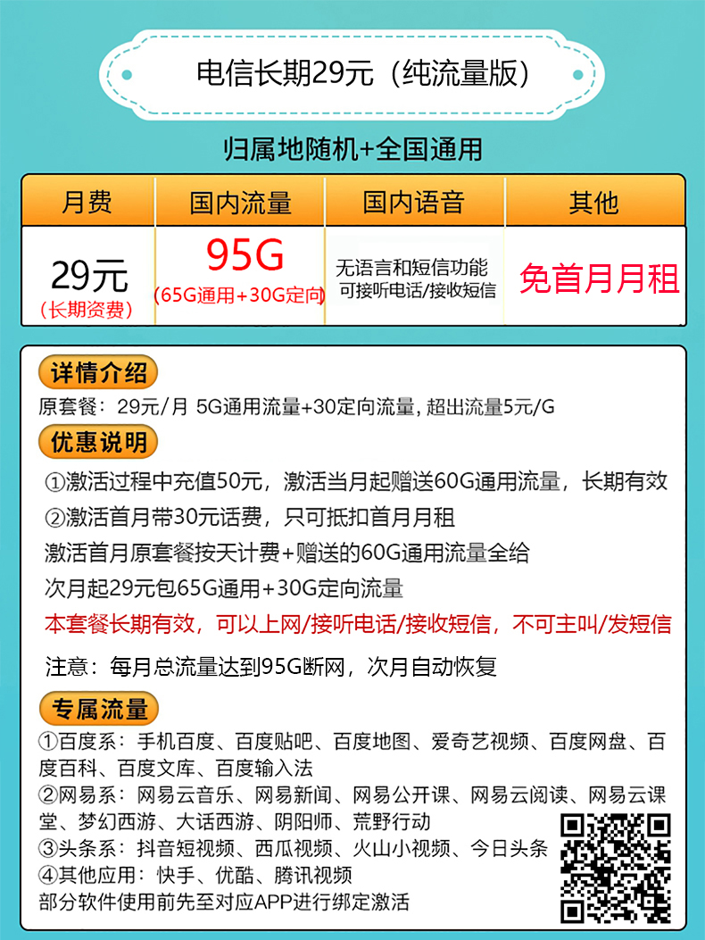 电信29元95G纯流量卡,每月包含65G通用流量+30G热门APP定向流量;本套餐为长期套餐、长期资费,月租永久29元。