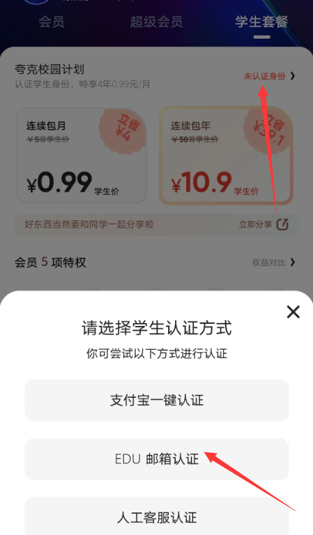 3)夸克校园计划,点击弹出认证方式,选择EDU邮箱认证