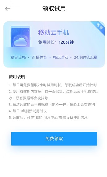 2. 已注册并登录的用户,均可获得每日免费试用2小时的福利。2小时后云手机资源自动回收,每日0点更新试用时长。