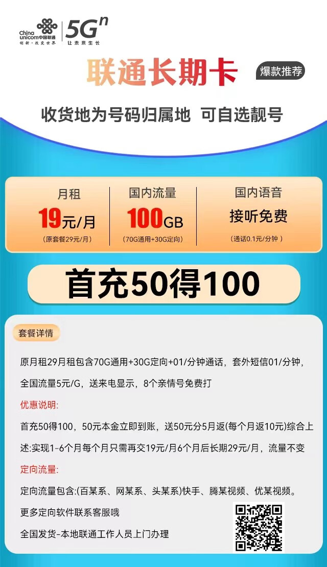 史无前例的本地联通长期流量卡上线啦!月租29元包含70G全国流量+30G定向流量,长期套餐,月租和套餐内容长期不变!收货地就是归属地,本地联通营业厅上门选号、开卡、激活。激活后参加预存还能享受50元话费赠送活动!
