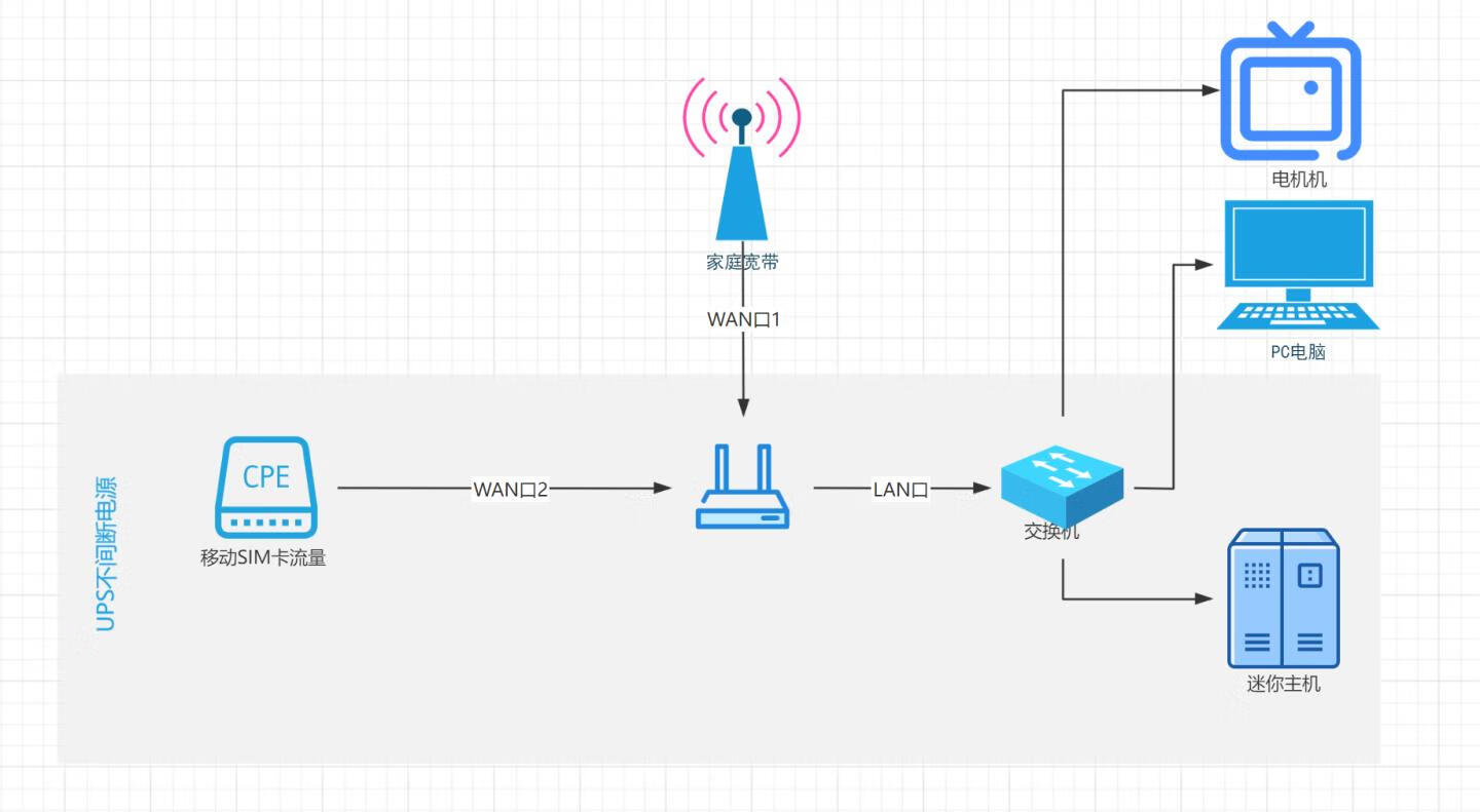 高成本版,俩个网络切换在路由器中配置切换策略。下游的设备包括迷你主机都不需特殊操作。