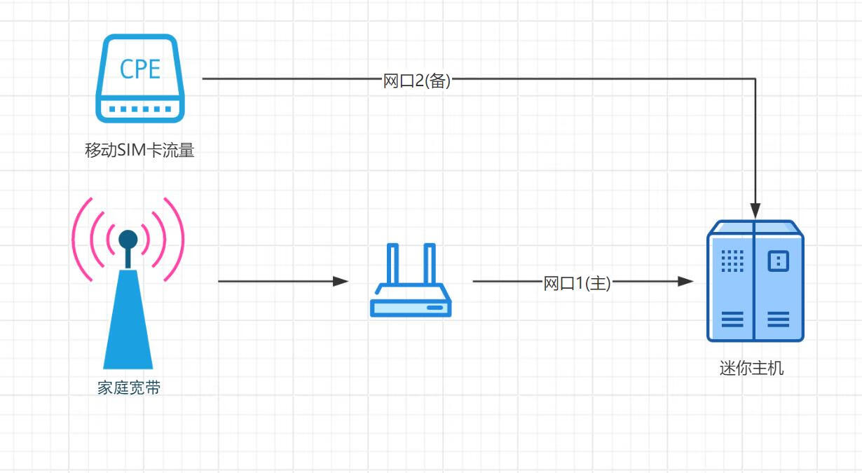 优先走家庭宽带,宽带不可用时切换到手机流量卡!