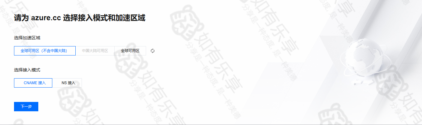第三步:选择加速区域。已备案域名可选【全球可用区】。接入模式支持 CNAME 和 NS,根据自己的情况选择!