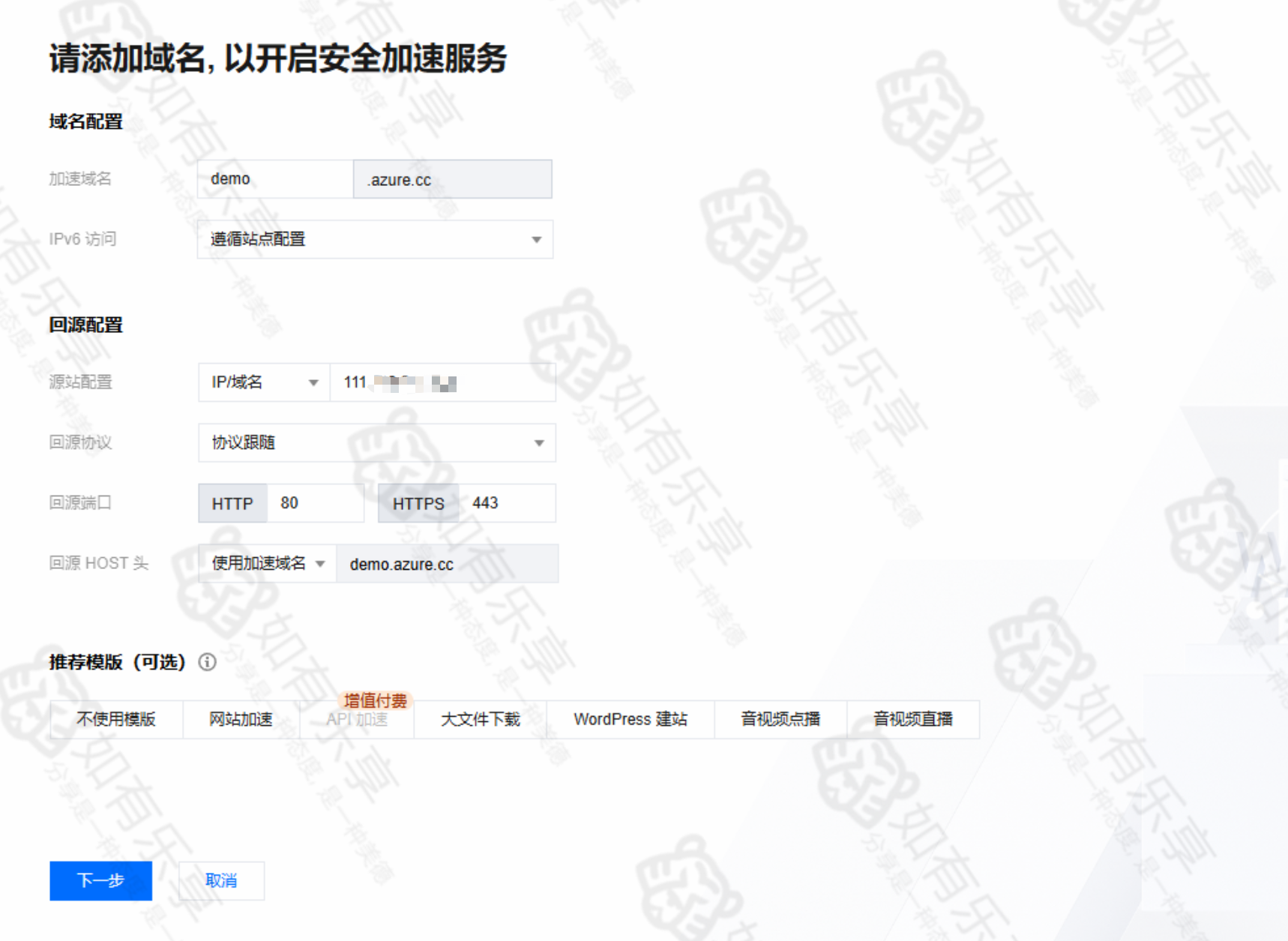 域名前缀输入加速域名,源站配置中填写IP或者域名。