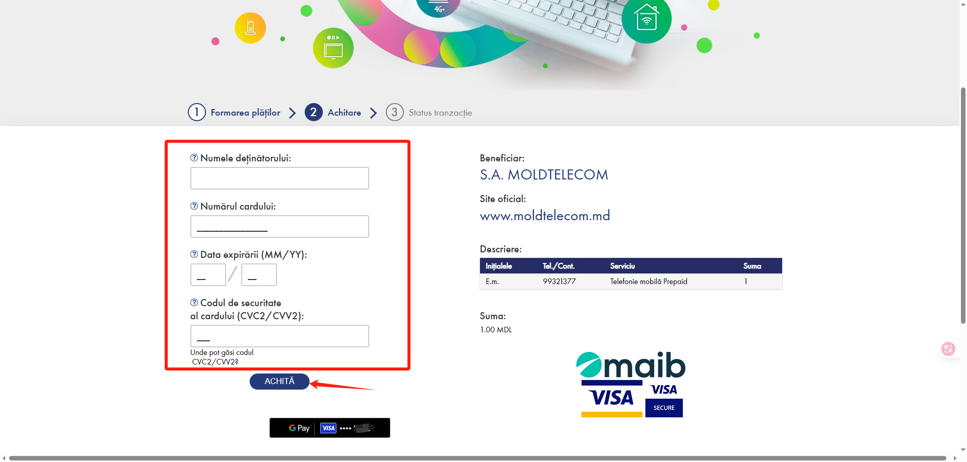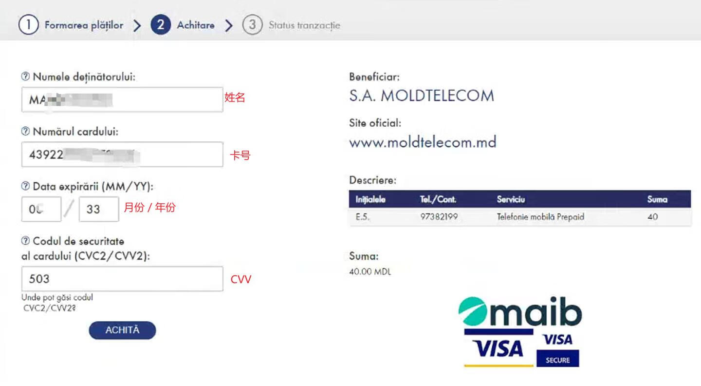 第一步:点击:小三角展开,勾选号码,输入:充值金额(最小1MDL),点击:Achitǎ cu card bancar,转跳充值