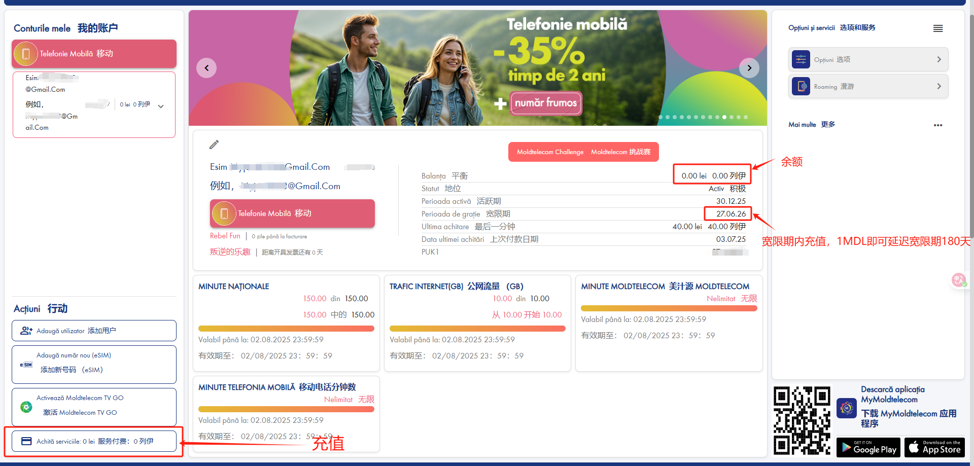 第三步:注册后就会自动进入号码管理页面,我们使用40MDL开卡后,有效期是两个月,两个月没有任何消费(拨打电话,发短信,流量),就会进入180的宽限期,我们在宽限内充值1MDL(0.4CNY)即可延迟宽限期180天宽限期内只能接收短信,接听电话,拨打紧急电话112,宽限期结束就会回收号码,点击底部:Achită serviciile,可以对号码进行充值
