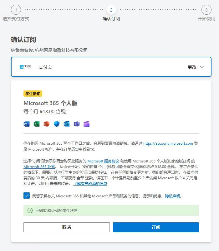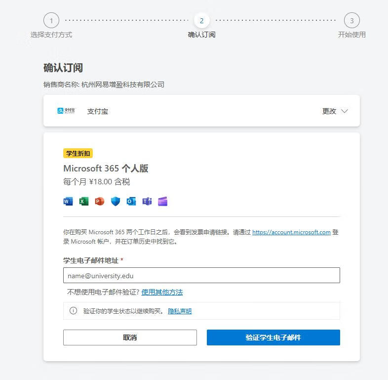1,本文主要演示使用edu.cn邮箱,支付方式绑定支付宝。订阅时扣费18元,后续每年2元!