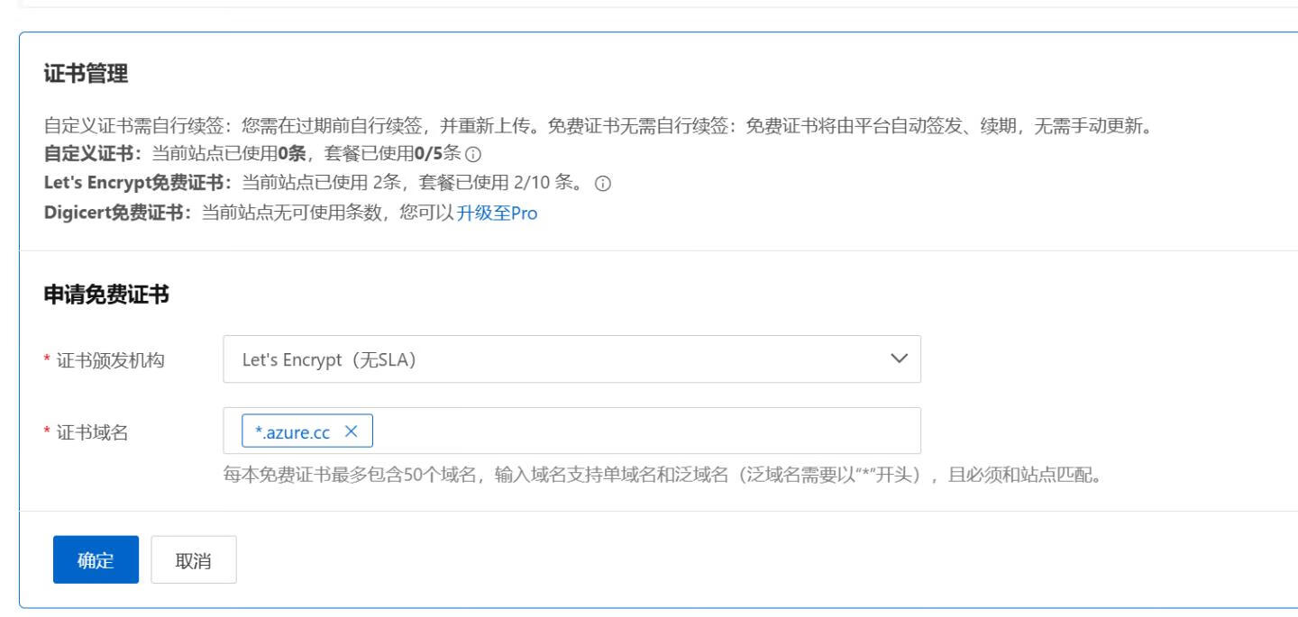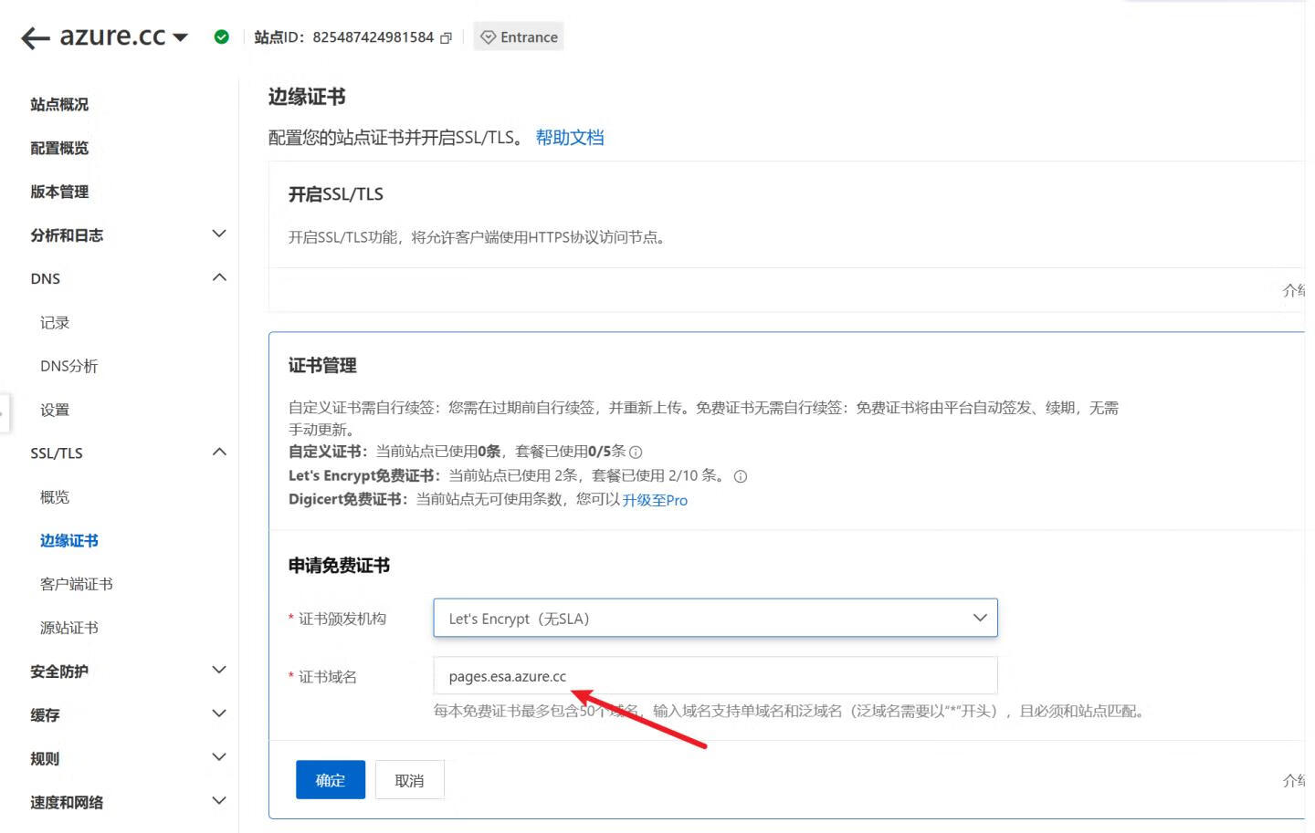 特别提醒:如下图申请 *.azure.cc 仅支持类似 a.azure.cc,b.azure.cc 这样的子域名。并不支持 pages.esa.azure.cc。如申请 *.esa.azure.cc证书才能支持 pages.esa.azure.cc。