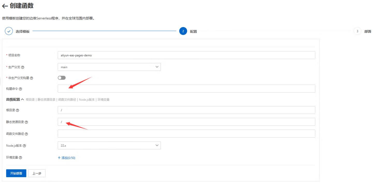 5,配置这里得注意下。因为我们演示的是部署静态页面。所以需要将构建命令框内容清空,静态资源目录填 /