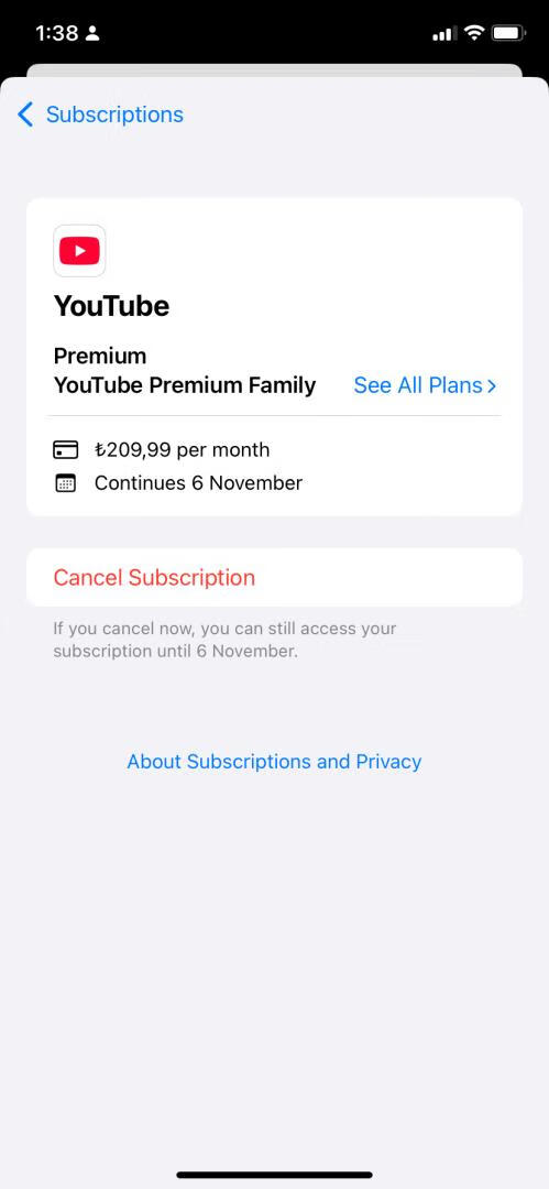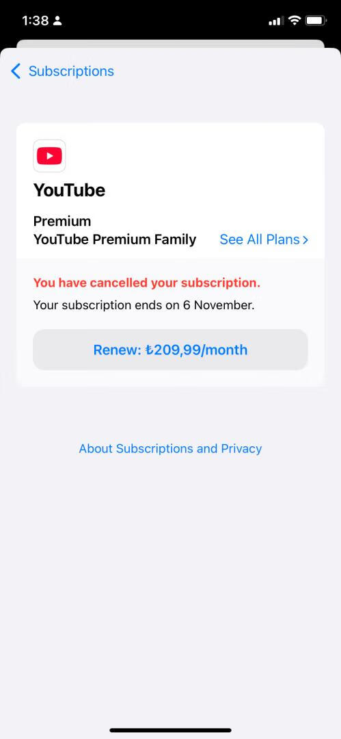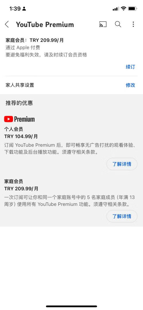 在2025年1月份,被印度取消续订。随后博主整车人切换到土耳其!历史文章:利用iOS内购开通土耳其区YouTube Premium家庭订阅