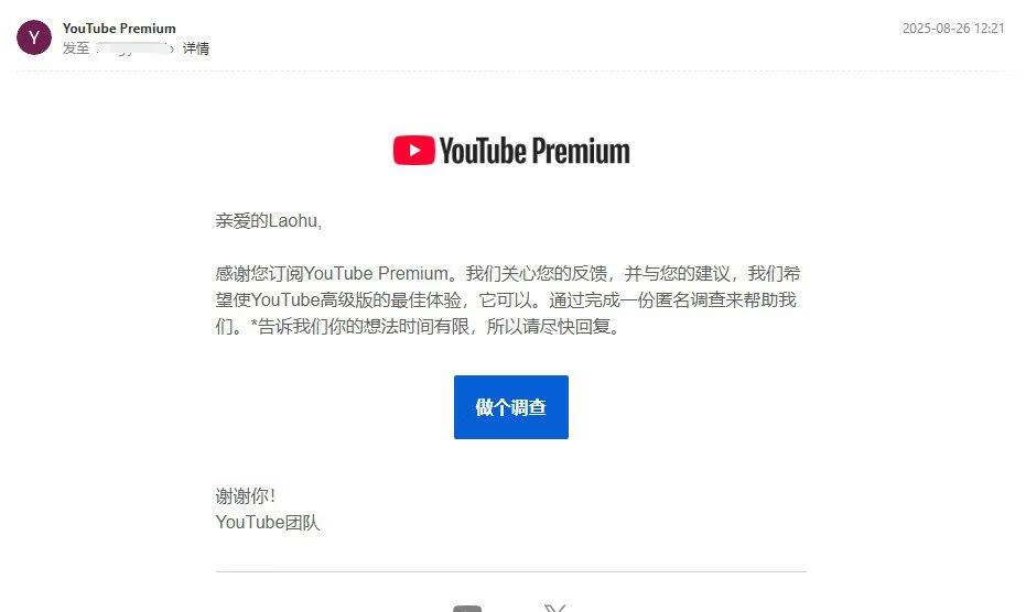 感谢您成为我们重要的 YouTube Premium 会员。祝好!