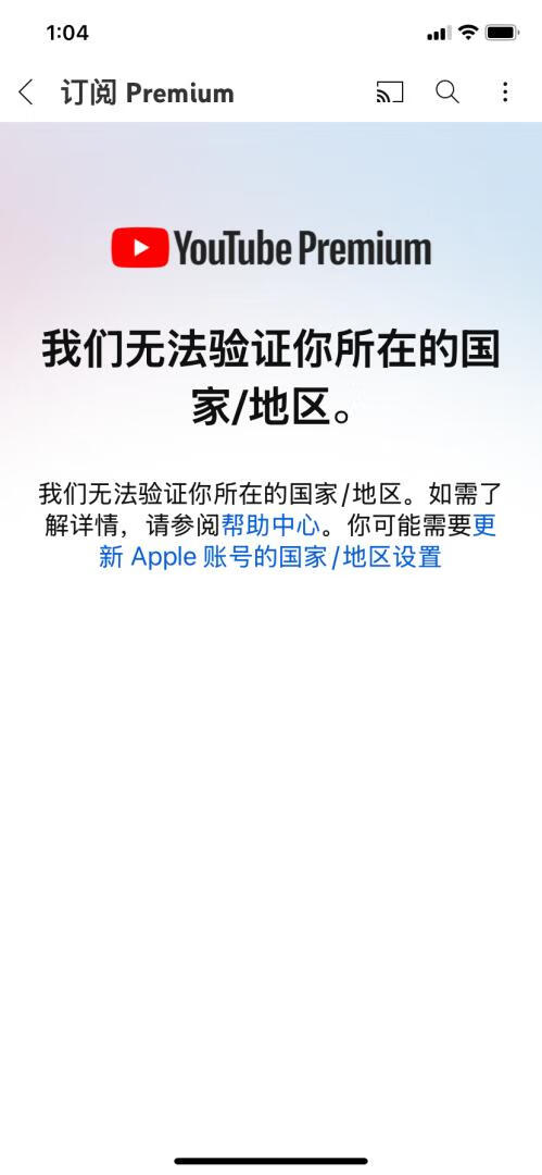 如果在Youtube应用内直接续订,会提示【我们无法验证你所在的国家/地区】。