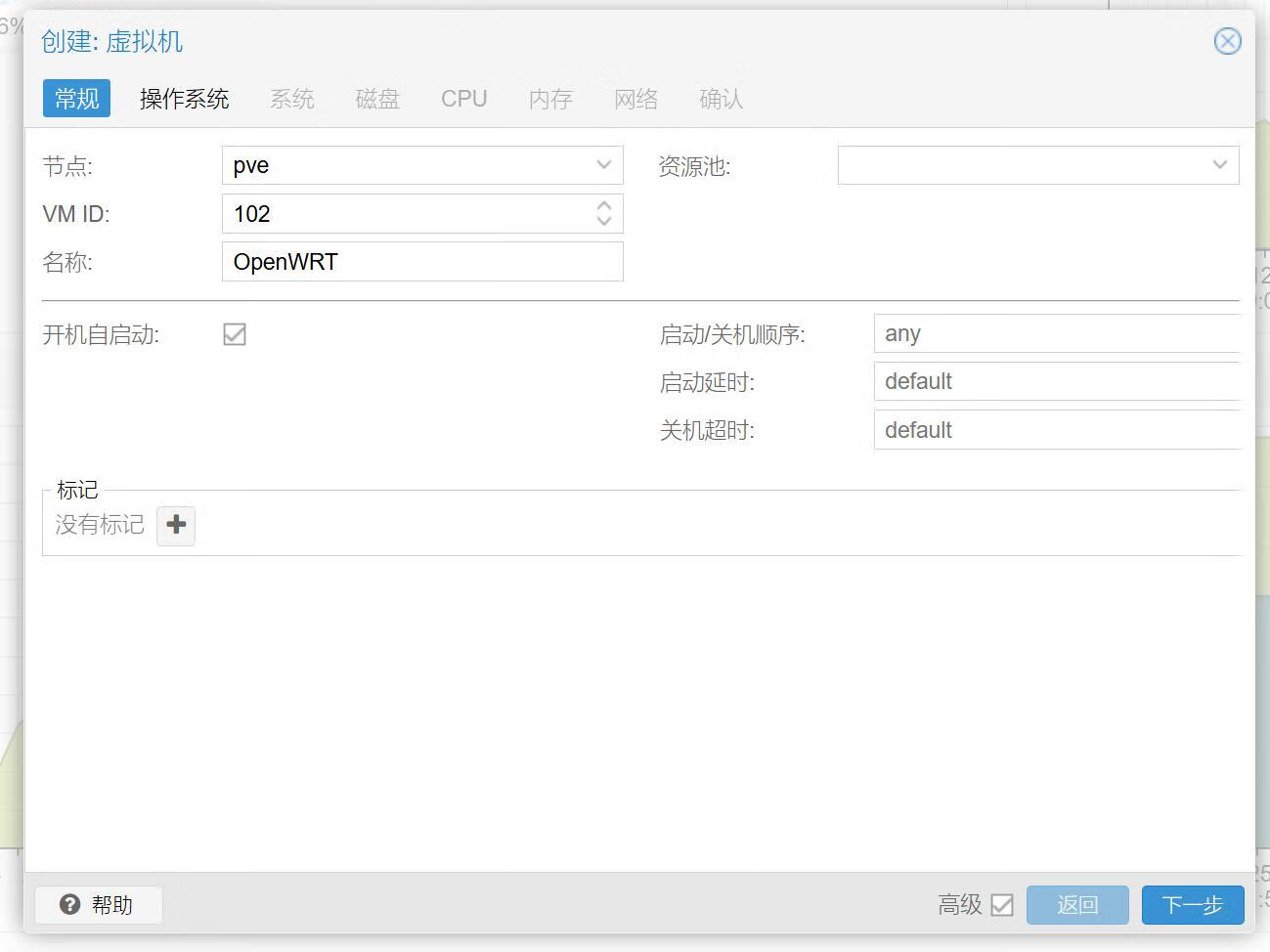 1,Proxmox 新建虚拟机,名称随意,注意 VM ID(后面会用到)