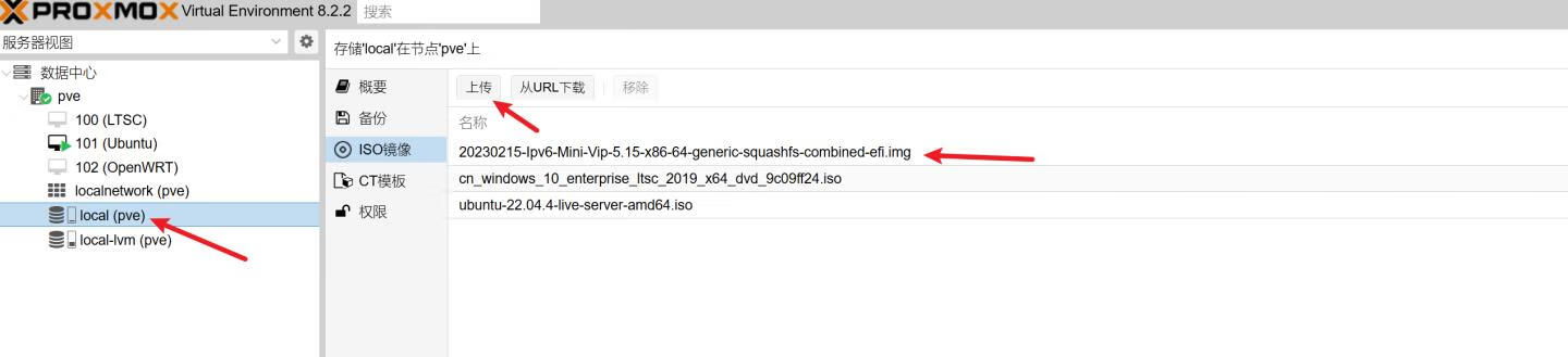 访问 【local(pve)】 - 【ISO镜像】 - 上传 (选择童鞋下载的OpenWrt镜像文件)