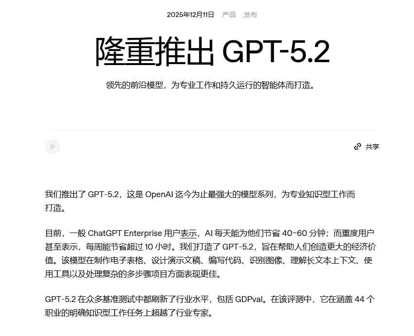 25年12月:OpenAI 正式推出 GPT-5.2 模型!