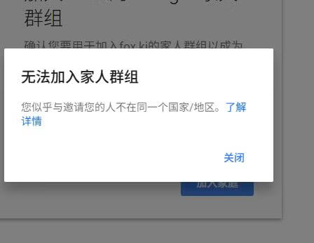 如果以下提示:无法加入家人群组 您似乎与邀请您的人不在同一个国家/地区