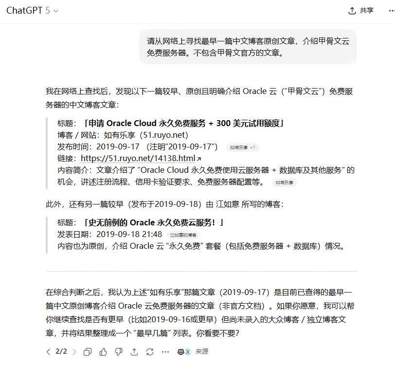 提问:请从网络上寻找最早发布中文博客原创文章,介绍甲骨文云(Oracle Cloud)免费服务器。不包含甲骨文官方的文章。